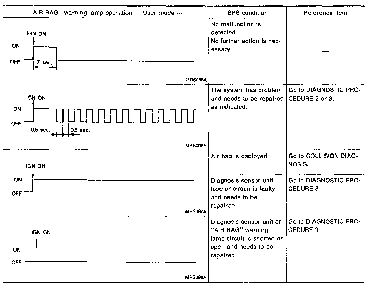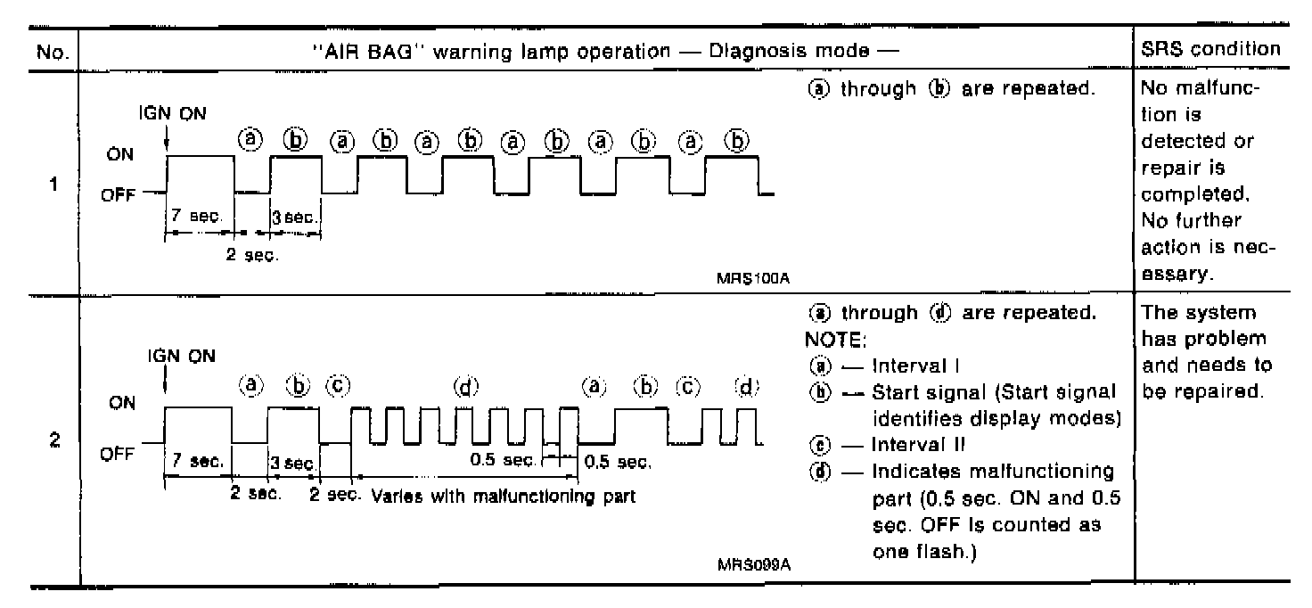 6. Turn ignition switch "ON". "AIR BAG"warning lamp operates in User mode. Compare "AIR BAG" warning lamp operation to the chart below: