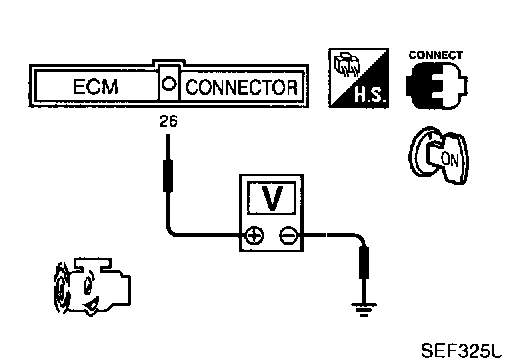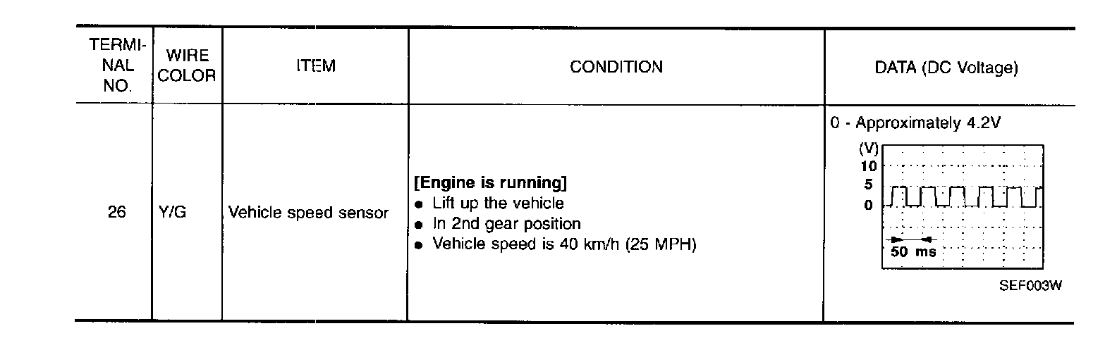 3. Read the voltage signal between ECM terminal 26 (Vehicle speed sensor signal) and ground with oscilloscope.