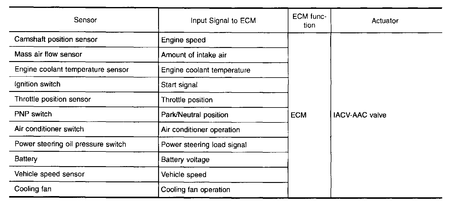 This system automatically controls engine idle speed to a specified level. Idle speed is controlled through tine adjustment of the amount of air which bypasses the throttle valve via IACV-AAC valve. The IACV-AAC valve repeats ON/OFF operation according to the signal sent from the ECM. The camshaft position sensor detects the actual engine speed and sends a signal to the ECM. The ECM then controls the ON/OFF time of the IACV-AAC valve so that engine speed coincides with the target value memorized in ECM. The target engine speed is the lowest speed at which the engine can operate steadily. The optimum value stored in the ECM is determined by taking into consideration various engine conditions, such as during warm up, deceleration, and engine load (air conditioner, power steering and cooling fan operation).
