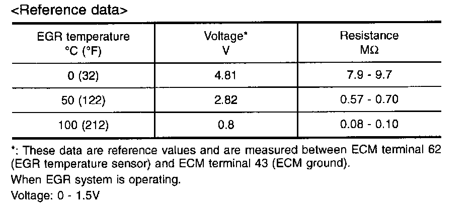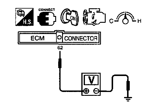 3. Check voltage between ECM terminal 62 (EGR temperature sensor signal) and ground at about 1,500 rpm with EGR valve lifted up to the full position by hand.