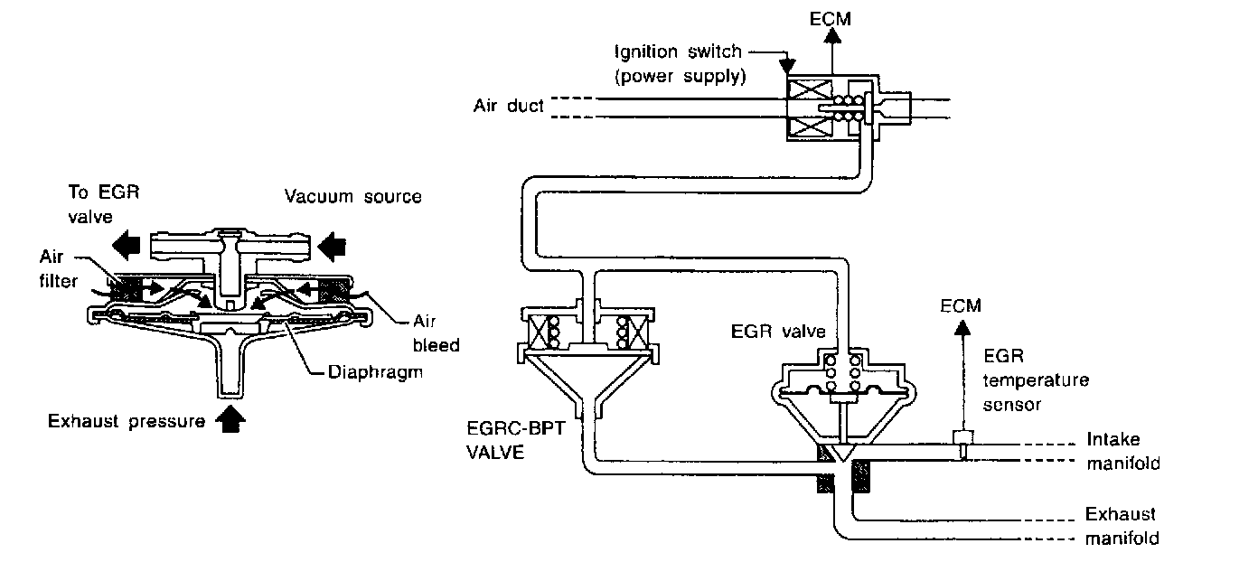 The EGRC-BPT valve monitors exhaust pressure to activate the diaphragm, controlling throttle body vacuum applied to the EGR valve. In other words, recirculated exhaust gas is controlled in response to positioning of the EGR valve or to engine operation.