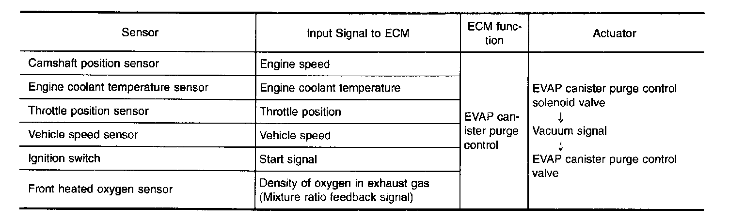 The EVAP canister purge control solenoid valve responds to signals from the ECM. When the ECM sends an OFF signal, the vacuum signal (from the intake manifold to the EVAP canister purge control valve) is cut.