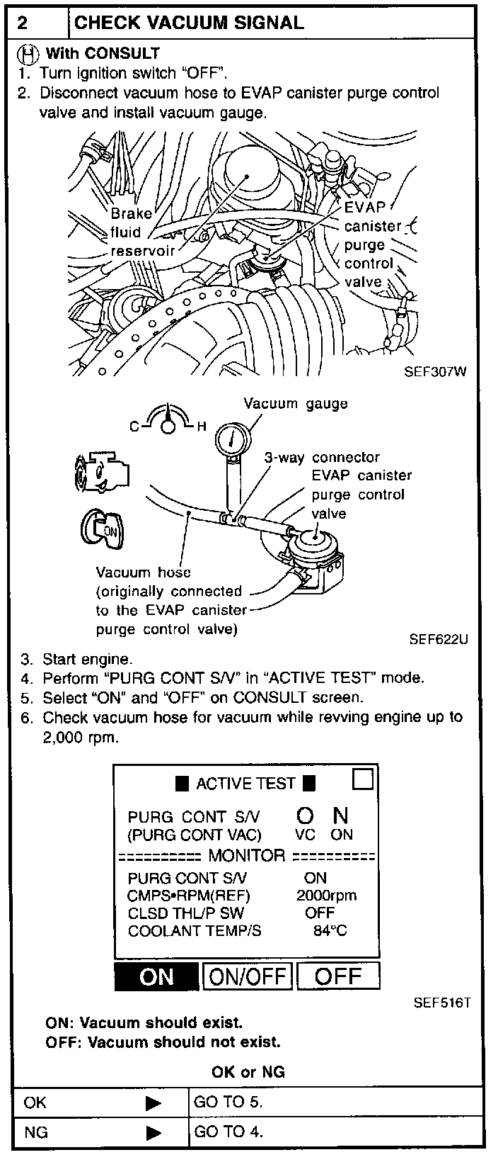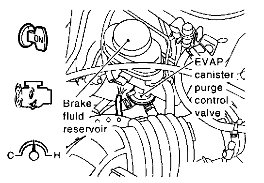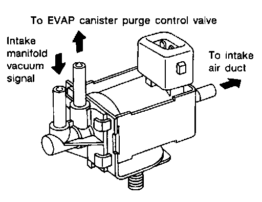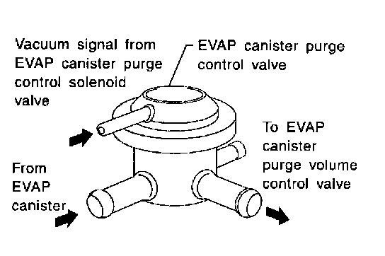 When the ECM sends an ON (ground) signal, the vacuum signal passes through the EVAP canister purge control solenoid valve. The signal then opens the EVAP canister purge control valve.