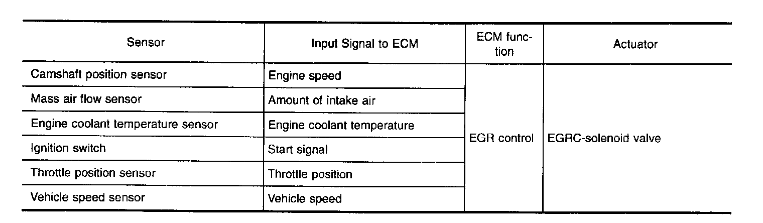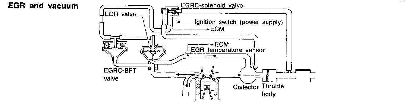 This system cuts and controls vacuum applied to the EGR valve to suit engine operating conditions. This cut-and-control operation is accomplished through the ECM and the EGRC-solenoid valve. When the ECM detects any of the following conditions, current through the solenoid valve is cut. This causes the vacuum to be cut. The EGR valve remains closed.