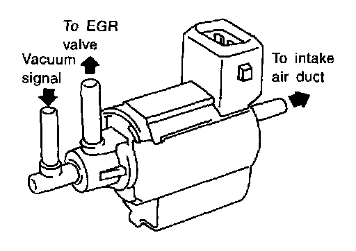 The EGRC-solenoid valve responds to signals from the ECM. When the ECM sends an ON (ground) signal, the coil in the solenoid valve is energized. The vacuum signal passes through the solenoid valve. The signal then reaches the EGR valve.