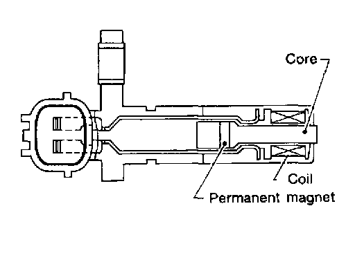 The sensor consists of a permanent magnet, core and coil. When the engine is running, the high and low parts of the teeth cause the gap with the sensor to change.