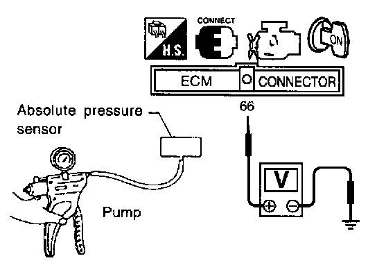 3. Turn ignition switch "ON" and check output voltage between ECM terminal 66 (Absolute pressure sensor signal) and engine ground.