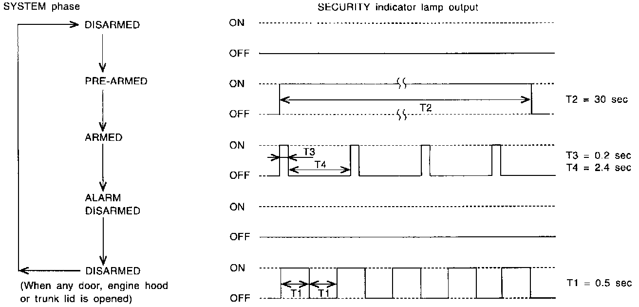 The theft warning system turns into the "pre-armed" phase when engine hood, trunk lid and all doors are closed and the doors are locked by key or multi-remote controller. (The security indicator lamp illuminates.) After about 30 seconds, the system automatically shifts into the "armed" phase (the system is set). (The security indicator lamp blinks every 2.4 seconds.)
