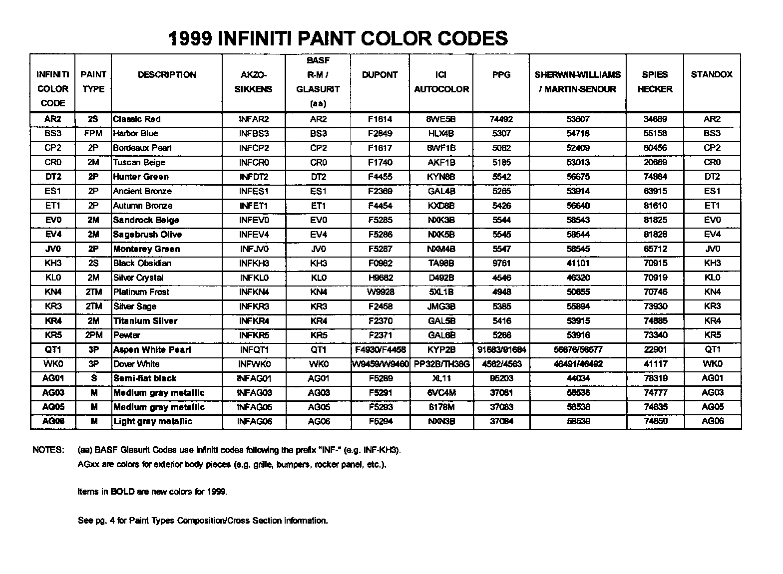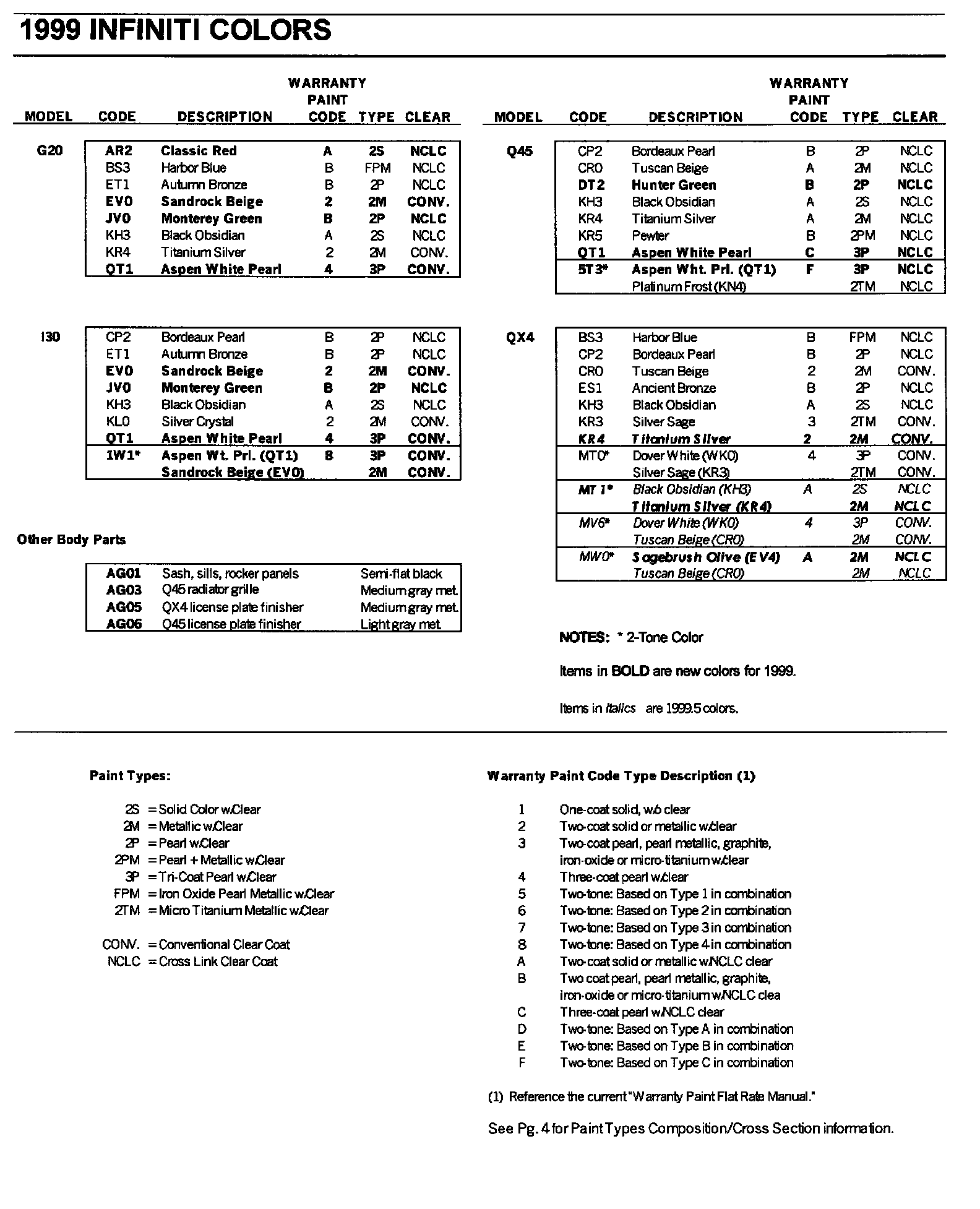 The following charts identify 1999 Infiniti paint codes, New Cross Link Clear Coat (NCLC) usage, color names and refinish paint codes for major automotive paint manufacturers. For approved NCLC clear coat products and procedures, refer to Infiniti Bulletin ITB95-016/BT95-006, dated March 22,1995.