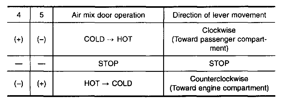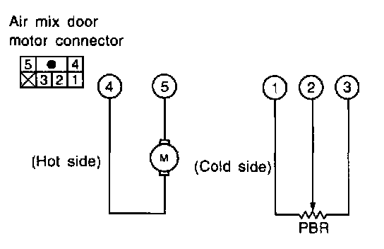 The air mix door motor is attached to the bottom of the heater unit. It rotates so that the air mix door is opened to a position set by the PTC. Motor rotation is then conveyed through a shaft and air mix door position is then fed back to the push control unit by PBR built-in air mix door motor.