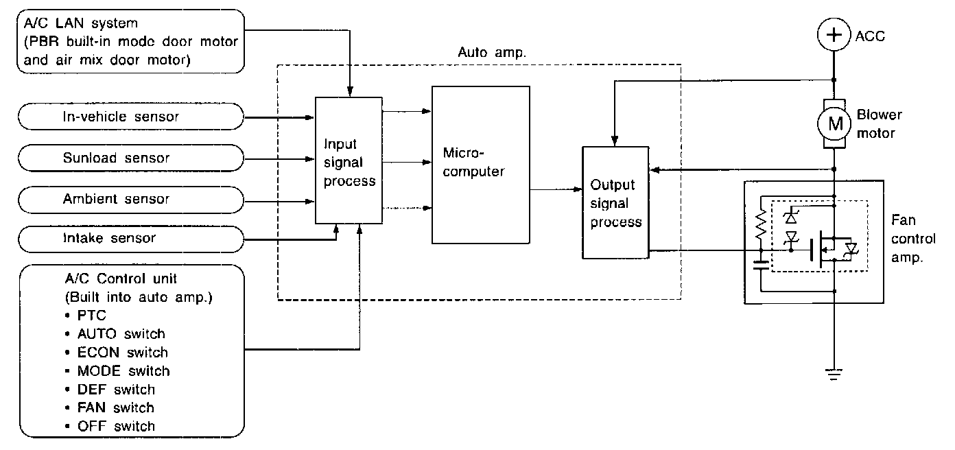 The control blower speed (in the range of 5 to 12V), the automatic amplifier supplies a gate voltage to the fan control amplifier. Based on this voltage, the fan control amplifier controls the voltage supplied to the blower motor.