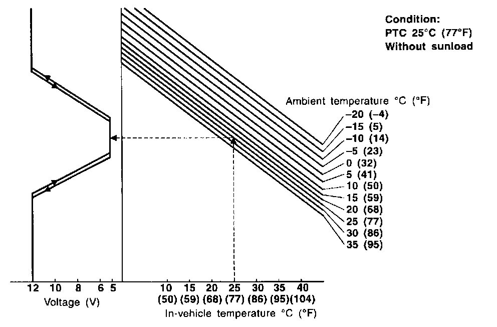 In the automatic mode, the blower motor speed is calculated by the automatic amplifier based on inputs from the PBR, in-vehicle sensor, sunload sensor, intake sensor and ambient sensor. The blower motor applied voltage ranges from approximately 5 Volts (lowest speed) to 12 Volts (highest speed).