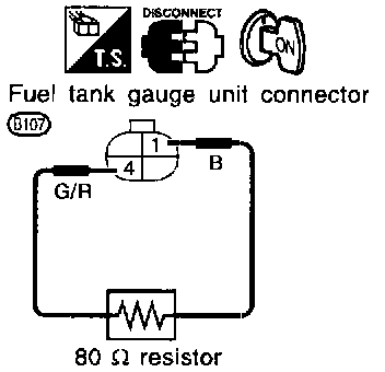 3. Connect a resistor (80 Ohms) between fuel tank gauge unit harness connector terminals 1 and 4.