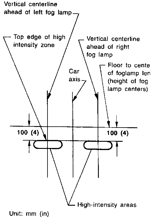 4. Adjust front fog lamps so that the top edge of the high intensity zone is 100 mm (4 in) below the height of the fog lamp centers as shown at left.