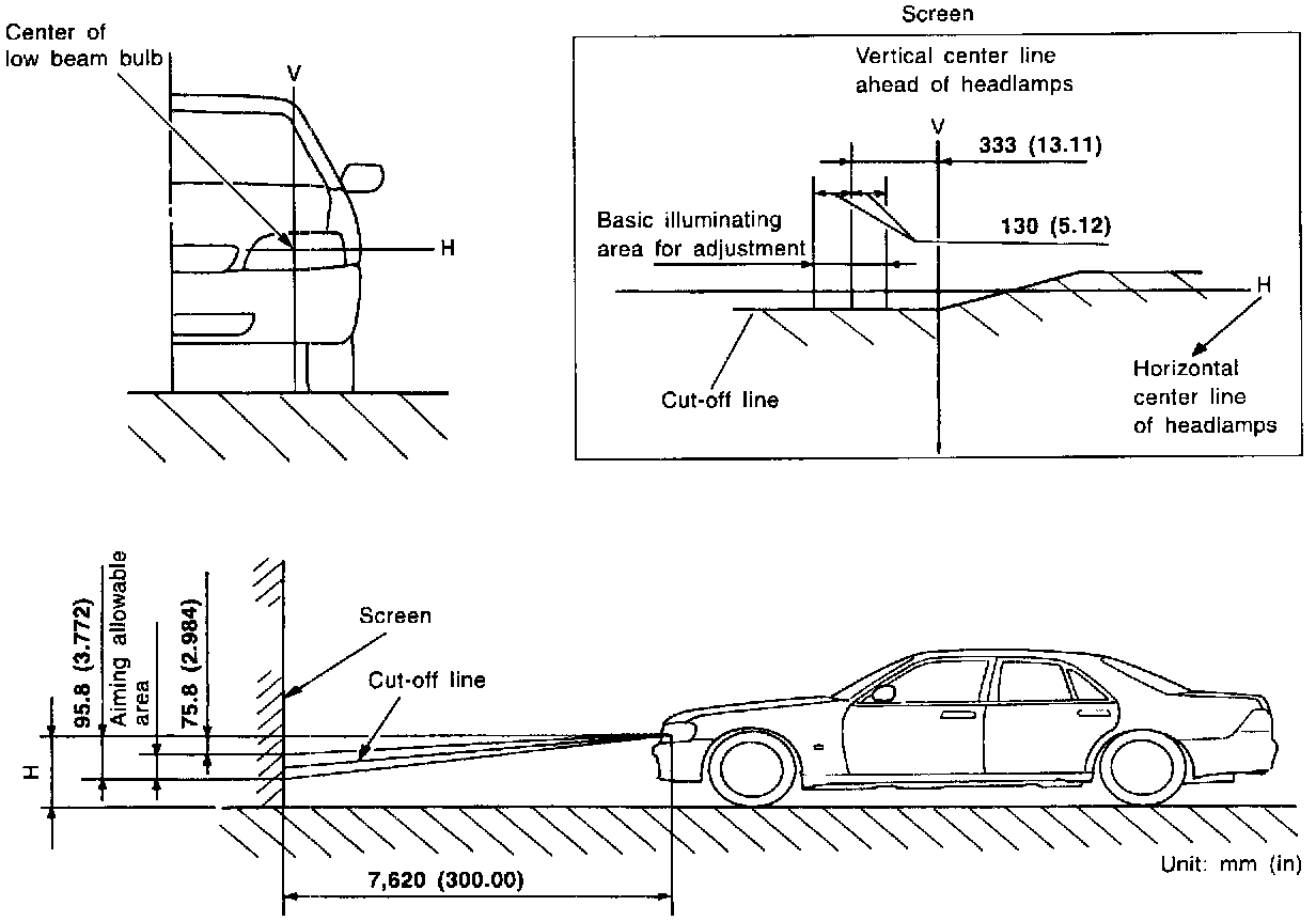 Aiming AdjustmentWhen performing headlamp aiming adjustment, use an aiming machine, aiming wall screen or headlamp tester. Aimers should be in good repair, calibrated and operated in accordance with respective operation.