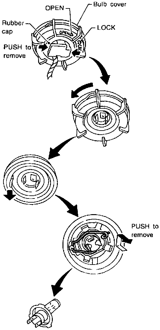 Bulb ReplacementThe headlamp is a semi-sealed beam type which uses a replaceable halogen bulb. The bulb can be replaced from the engine compartment side without removing the headlamp body.