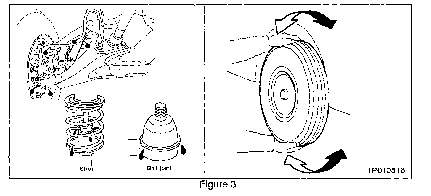 ^ Where applicable, check suspension ball joint for grease leakage and ball joint dust cover for cracks or other damages (see Figure 3).