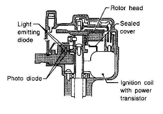 The rotor plate is positioned between the LED and the photo diode. The LED transmits light to the photo diode. As the rotor plate turns, the slits cut the light to generate rough-shaped pulses. These pulses are converted into on-off signals by the wave-forming circuit and sent to the ECM.