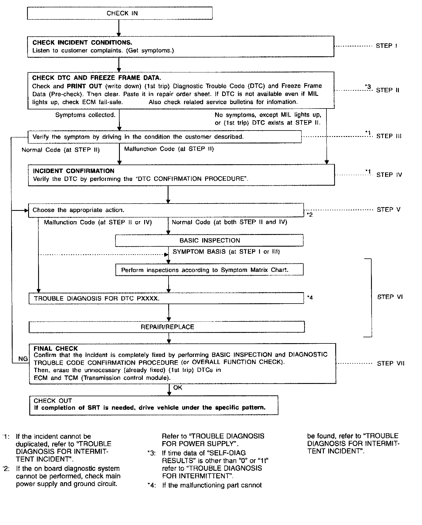 STEP II: Before confirming the concern, check and write down (print out using CONSULT or Generic Scan Tool) the (1st trip) Diagnostic Trouble Code (DTC) and the (1st trip) freeze frame data, then erase the code and the data.Reading Diagnostic Trouble Codes The (1st trip) DTC and the (1st trip) freeze frame data can be used when duplicating the incident at STEP III & IV.