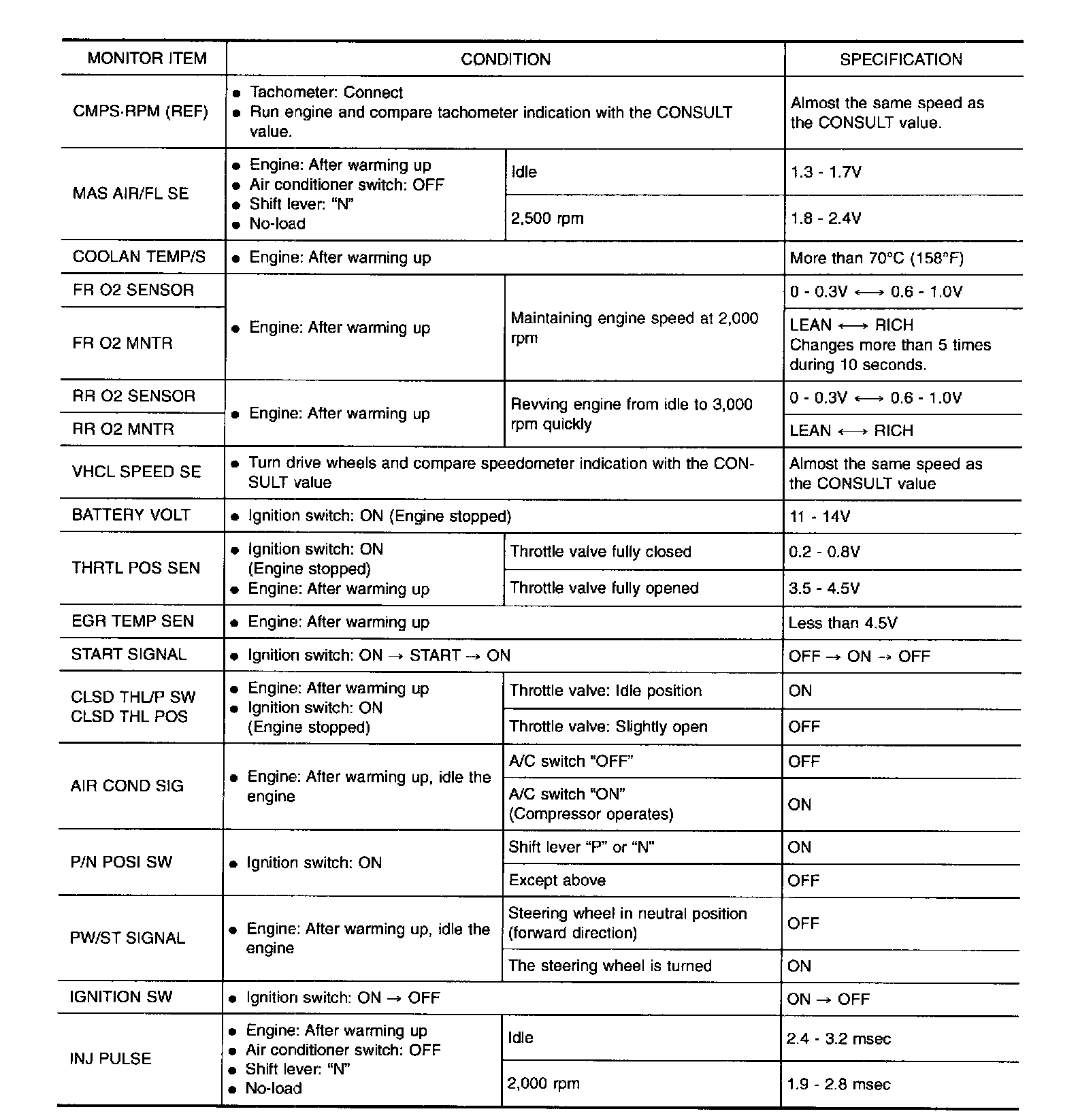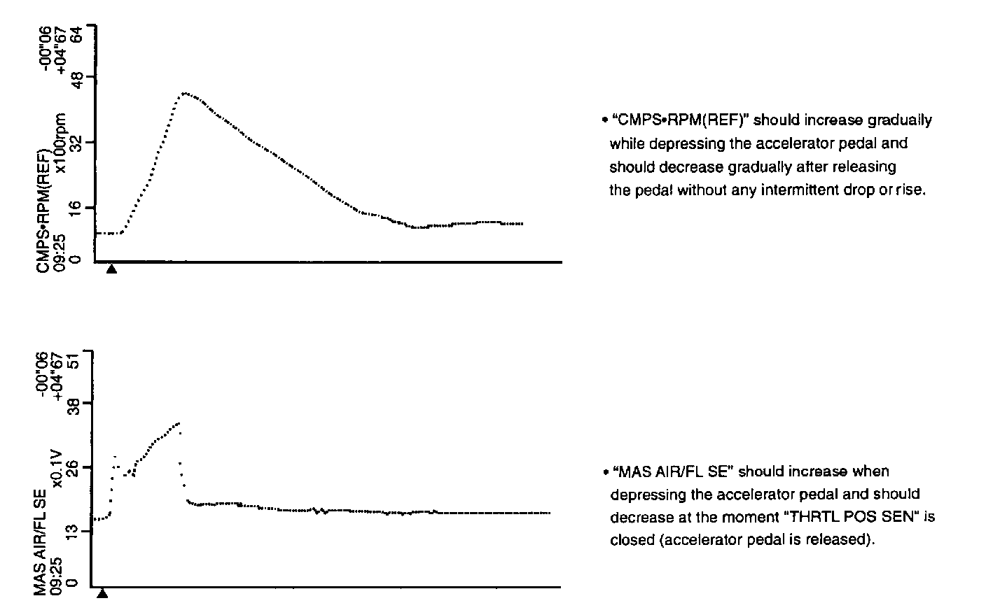 The following are the major sensor reference graphs in "DATA MONITOR" mode. (Select "HI SPEED" in "DATA MONITOR" with CONSULT)
