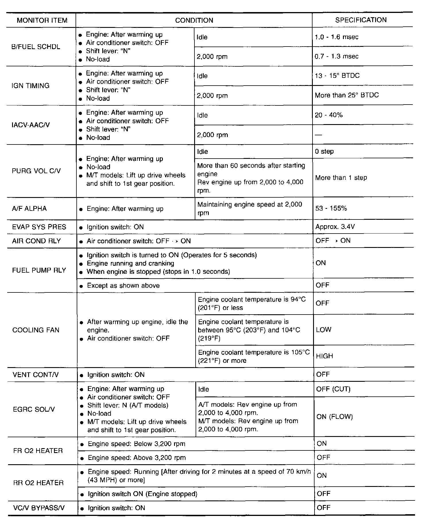 (i.e., Adjust ignition timing with a timing light before monitoring IGN TIMING. Specification data might be displayed even when ignition timing is not adjusted to specification. This IGN TIMING monitors the data calculated by the ECM according to the input signals from the camshaft position sensor and other ignition timing related sensors.)