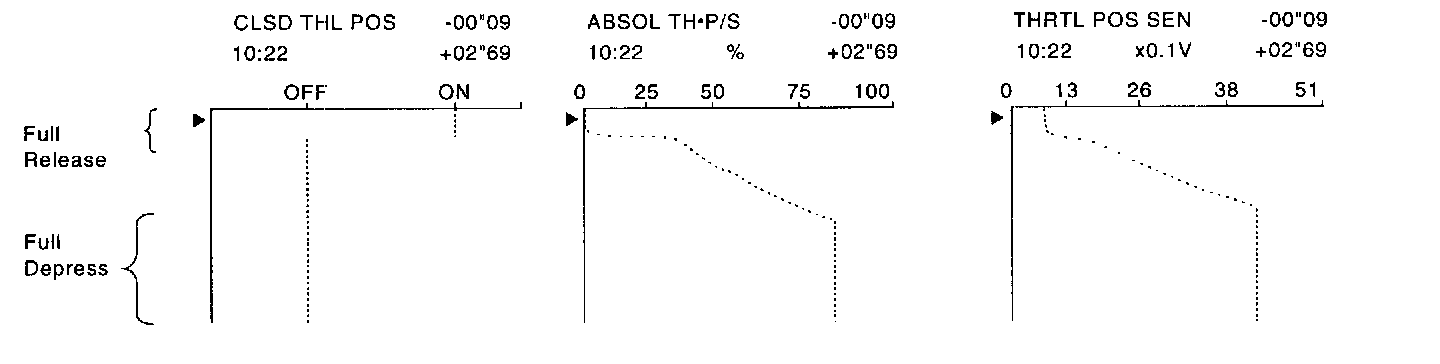 Below is the data for "THRTL POS SEN", "ABSOL TH.P/S" and "CLSD THL POS" when depressing the accelerator pedal with the ignition switch "ON".