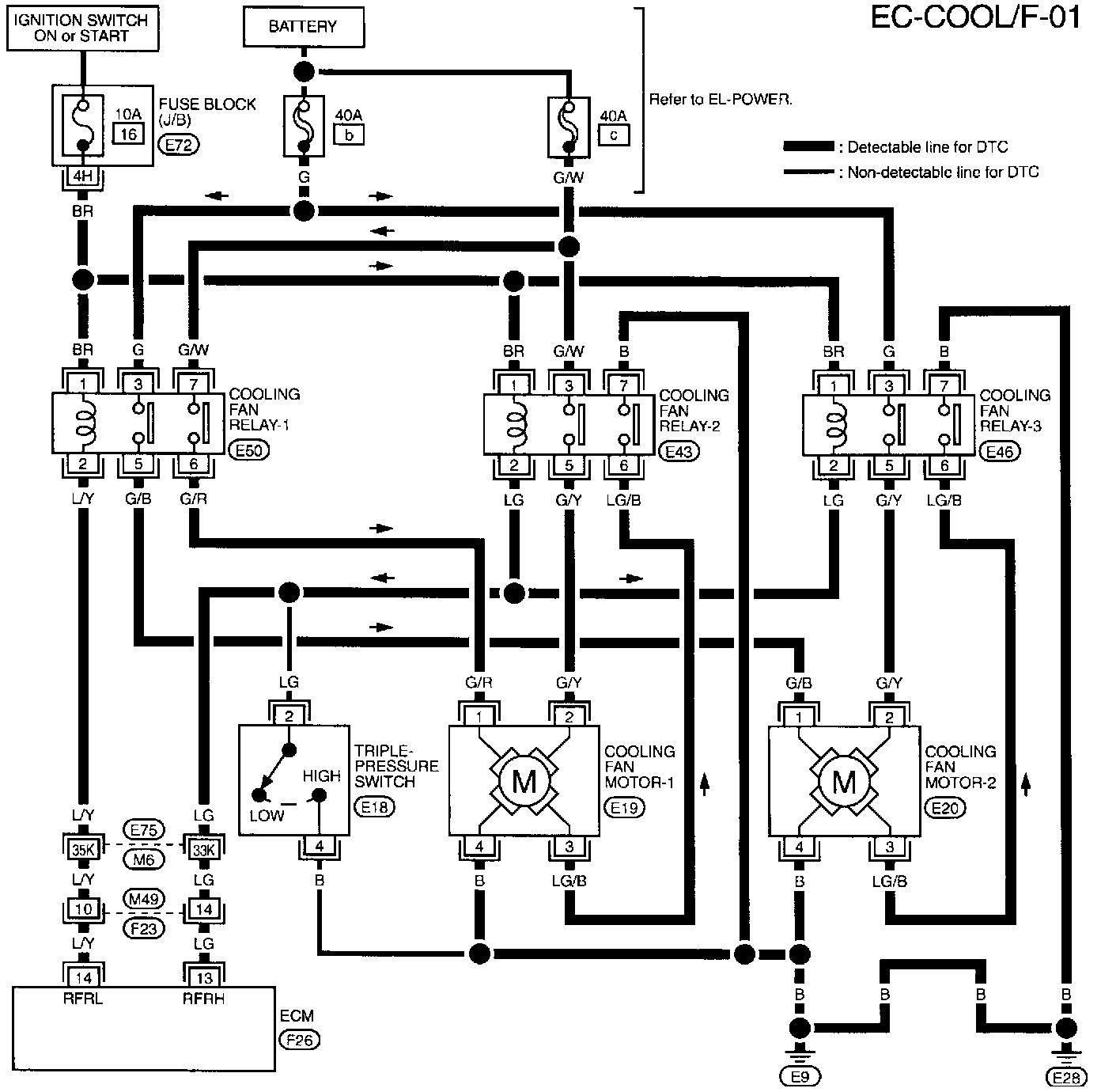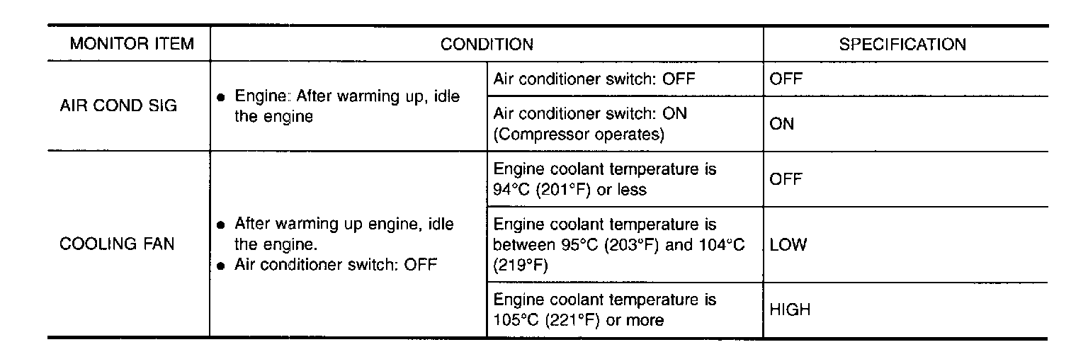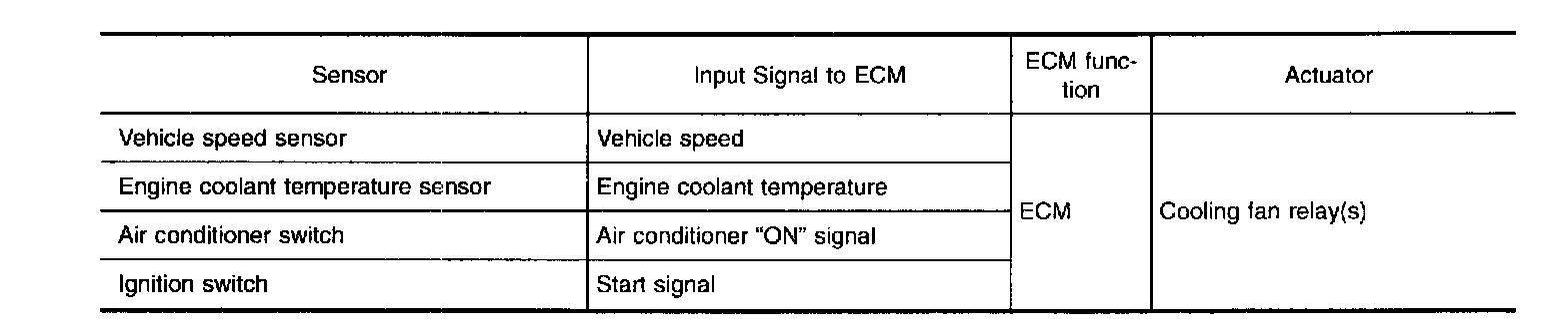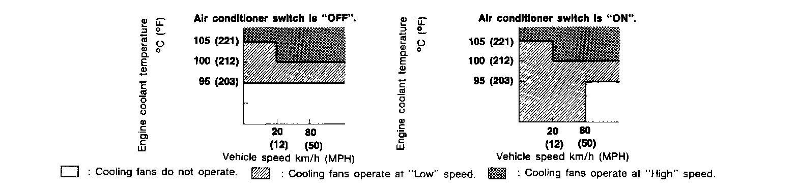 The ECM controls the cooling fan corresponding to the vehicle speed, engine coolant temperature, and air conditioner ON signal. The control system has 3-step control [HIGH/LOW/OFF]
