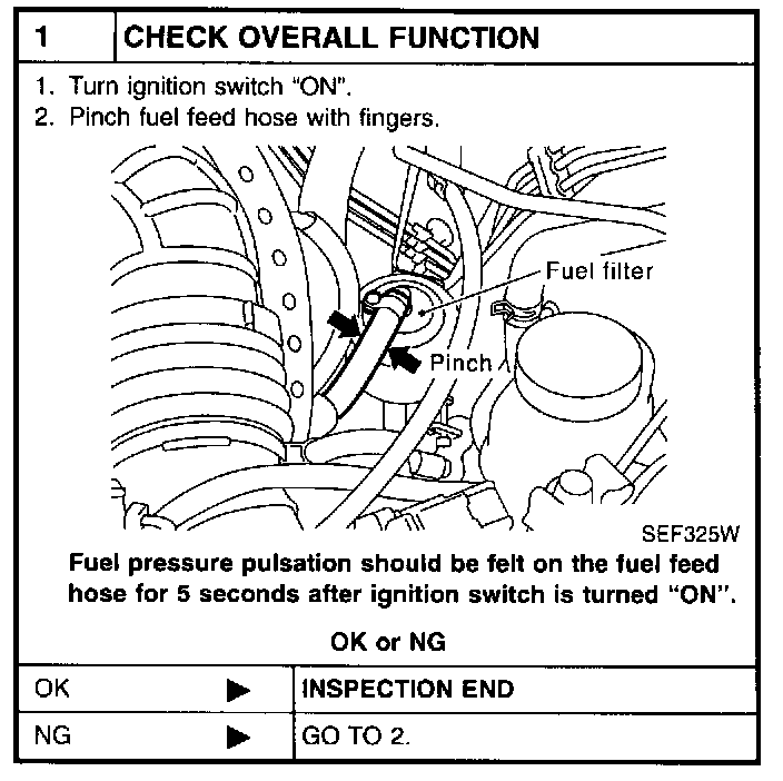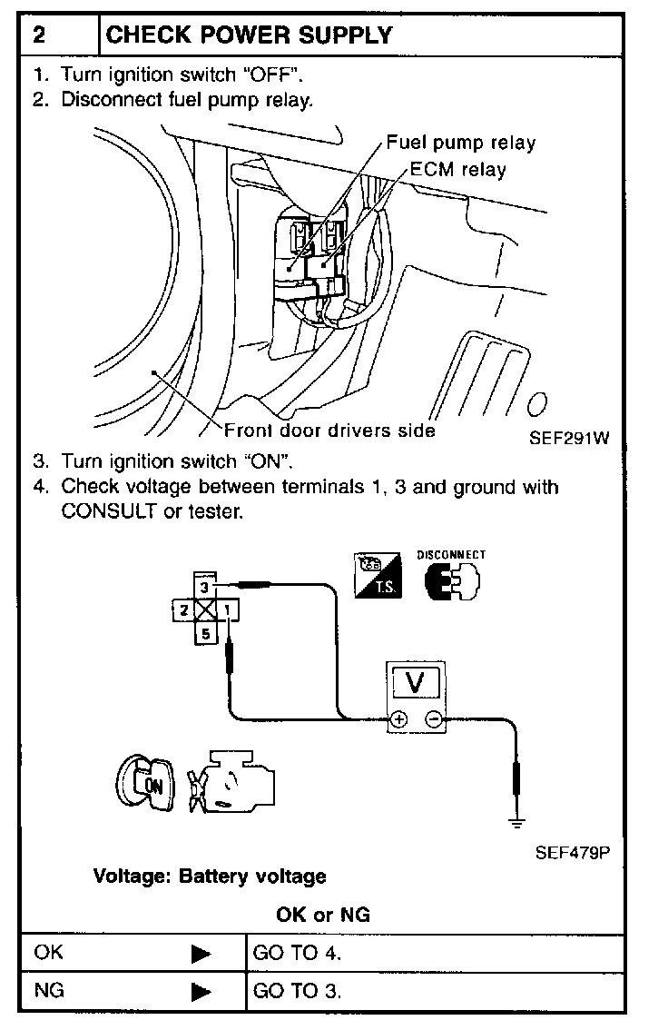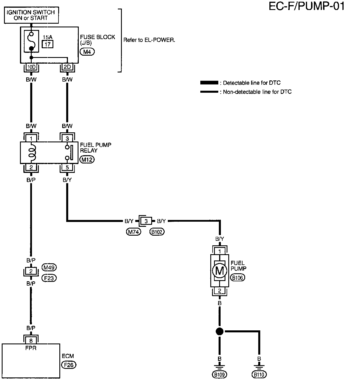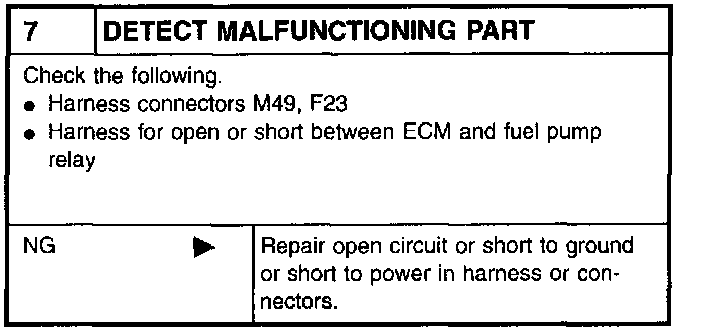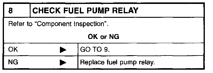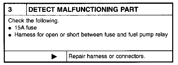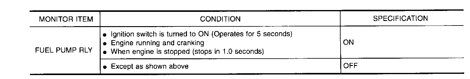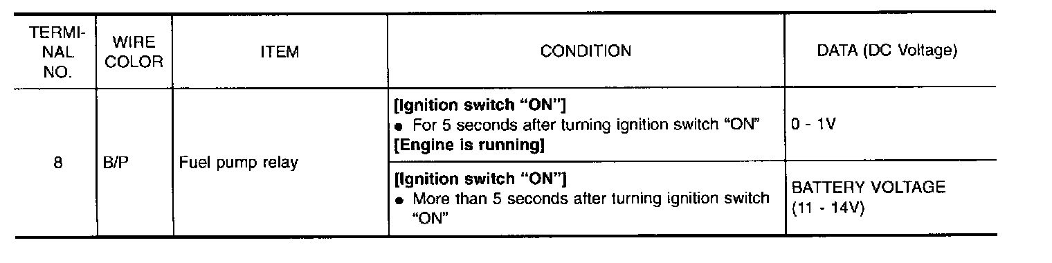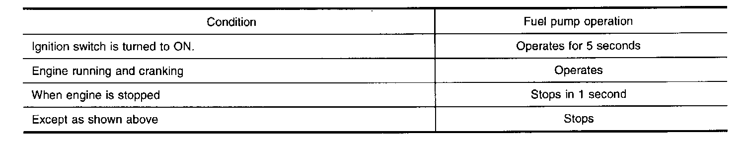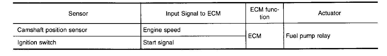 The ECM activates the fuel pump for several seconds after the ignition switch is turned on to improve engine startability. If the ECM receives a 180 ° signal from the camshaft position sensor, it knows that the engine is rotating, and causes the pump to perform. If the 1800 signal is not received when the ignition switch is ON, the engine stalls. The ECM stops pump operation and prevents battery discharging, thereby improving safety. The ECM does not directly drive the fuel pump. It controls the ON/OFF fuel pump relay, which in turn controls the fuel pump.