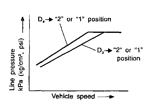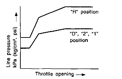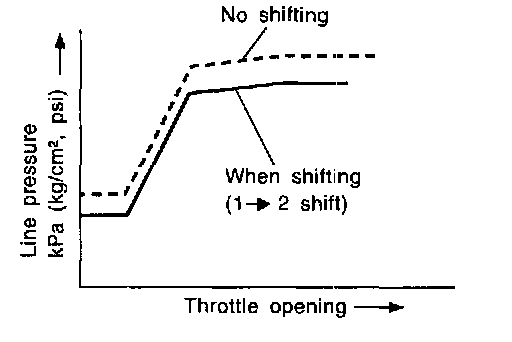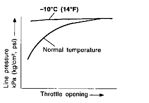 ^ Line pressure is increased to a maximum irrespective of the throttle opening when fluid temperature drops to -10°C (14°F). This pressure rise is adopted to prevent a delay in clutch and brake operation due to extreme drop of fluid viscosity at low temperature.