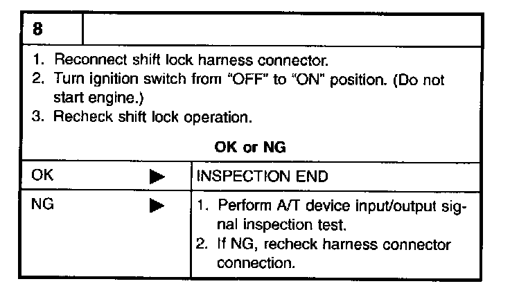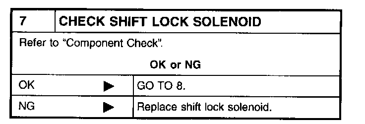 ^ Check operation by applying battery voltage to A/T device harness terminal 5 and shift lock solenoid & park position switch harness terminal 1.