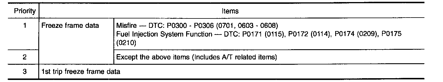 Only one set of freeze frame data (either 1st trip freeze frame data of freeze frame data) can be stored in the ECM. 1st trip freeze frame data is stored in the ECM memory along with the 1st trip DTC. There is no priority for 1st trip freeze frame data and it is updated each time a different 1st trip DTC is detected. However, once freeze frame data (2nd trip detection/MIL on) is stored in the ECM memory, 1st trip freeze frame data is no longer stored. Remember, only one set of freeze frame data can be stored in the ECM.