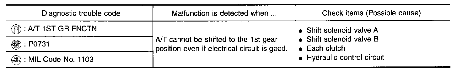 - This malfunction is detected when the A/T does not shift into first gear position as instructed by the TCM. This is not caused by electrical malfunction (circuits open or shorted) but by mechanical malfunction such as control valve sticking, improper solenoid valve operation, etc.