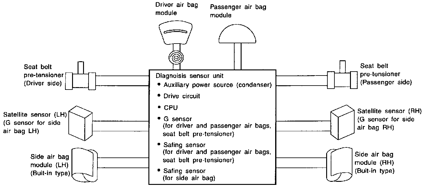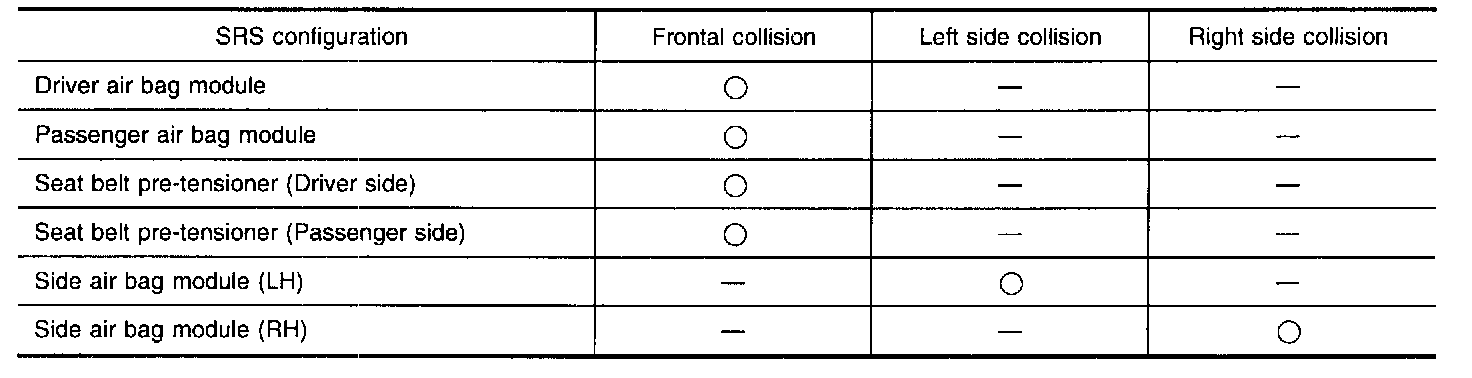 The collision modes for which supplemental restraint systems are activated are different among the SRS systems. For example, the driver air bag module and passenger air bag module are activated in a frontal collision but not in a side collision.