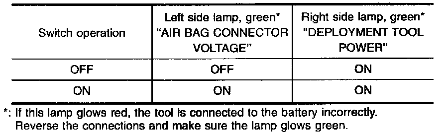 Press the deployment tool switch to the "ON" position. The left side lamp in the tool, marked "air bag connector voltage" should illuminate. If it does not illuminate, replace the tool.