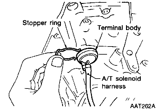 c. Push terminal body into transmission case and draw out solenoid harness.