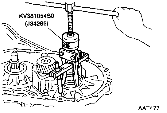 21. Remove differential side bearing outer race from transmission case.