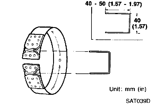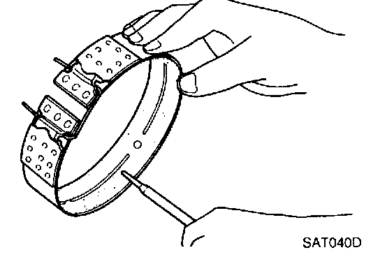^ To prevent brake linings from cracking or peeling, do not stretch the flexible band unnecessarily. When removing the brake band, always secure it with a clip as shown in the figure at left. Leave the clip in position after removing the brake band.