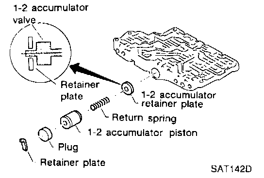^ Install return spring, 1-2 accumulator piston and plug.