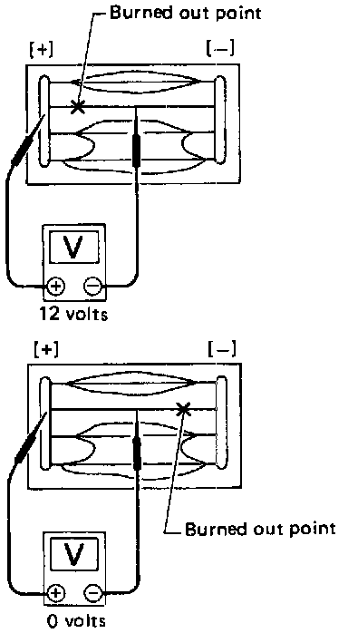 2. If a filament is burned out, circuit tester registers 0 or 12 Volts.