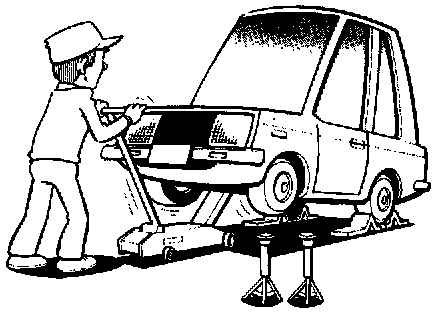 ^ Before jacking up the vehicle, apply wheel chocks or other tire blocks to the wheels to prevent the vehicle from moving. After jacking up the vehicle, support the vehicle weight with safety stands at the points designated for proper lifting before working on the vehicle.