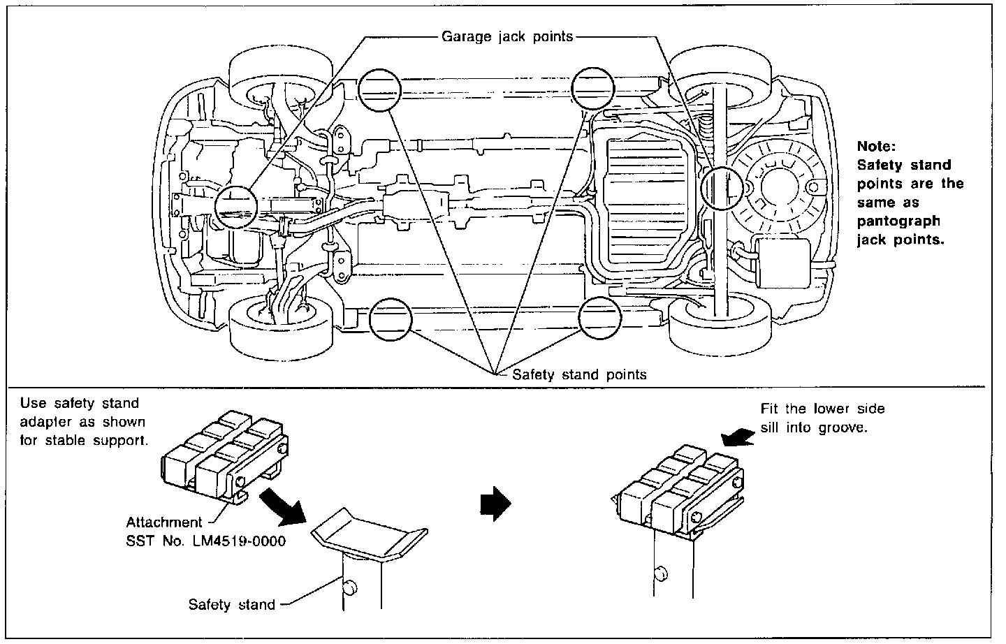 ^ Never get under the vehicle while it is supported only by the jack. Always use safety stands to support the frame when you have to get under the vehicle.