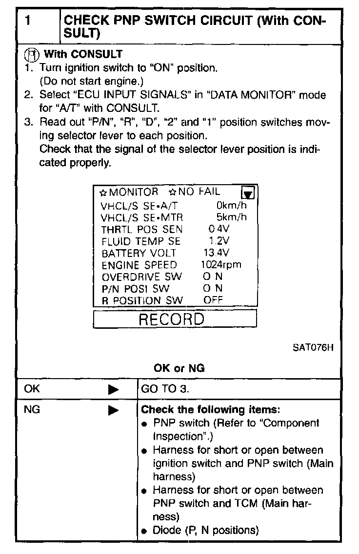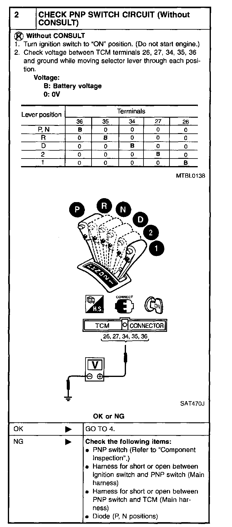4. If NG on step 2, remove PNP switch from A/T and check continuity of PNP switch terminals.