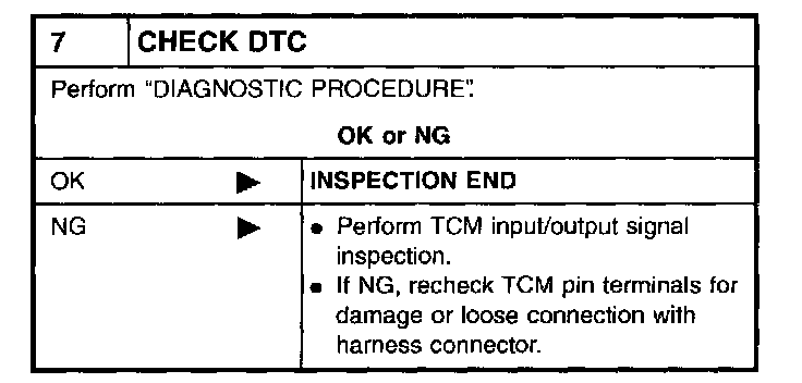 2. If NG, check again with manual control cable disconnected from manual shaft of A/T assembly. Refer to step 1.