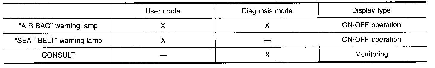 The User mode is exclusively prepared for the customer (driver). This mode warns the driver of a system malfunction through the operation of the "AIR BAG" warning lamp and/or "SEAT BELT" warning lamp.