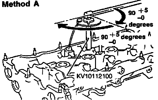 If angle wrench is not available, do the following. Mark the side of all bolts with paint marks facing the front of the engine. Then turn them 90 to 95 degrees clockwise.