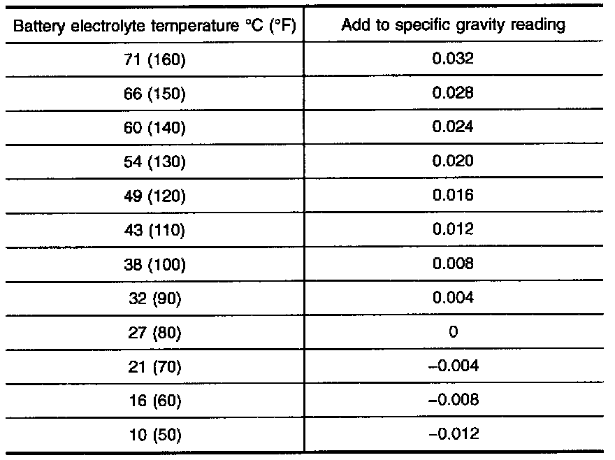 Use the chart to correct your hydrometer reading according to electrolyte temperature.