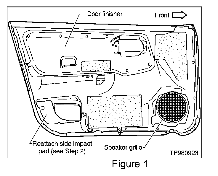 2. Reattach the side impact pad to the inside of the door finisher using 3M Super Weatherstrip Adhesive (3M P/N 051135 08008) or equivalent.