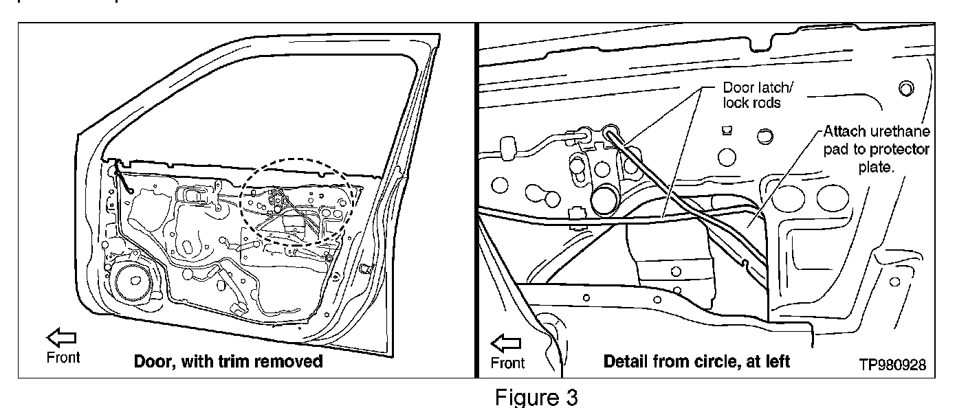 2. Attach urethane pad P/N 76268-9E005 to the inside of the protector plate at the point where the lock/latch rods are contacting it.