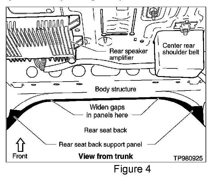 This incident may be duplicated by tapping or knocking on rear parcel shelf. This incident may be caused by intermittent contact between the rear seat back support and the edge of the body structure (see Figure 4).