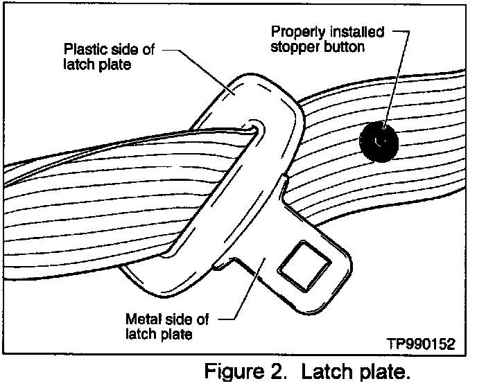 5. Insert the male portion of the button, at the original position, into the belt from the plastic side of the latch plate (see Figure 2).
